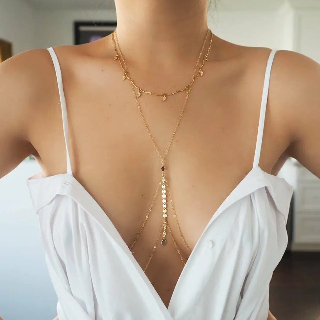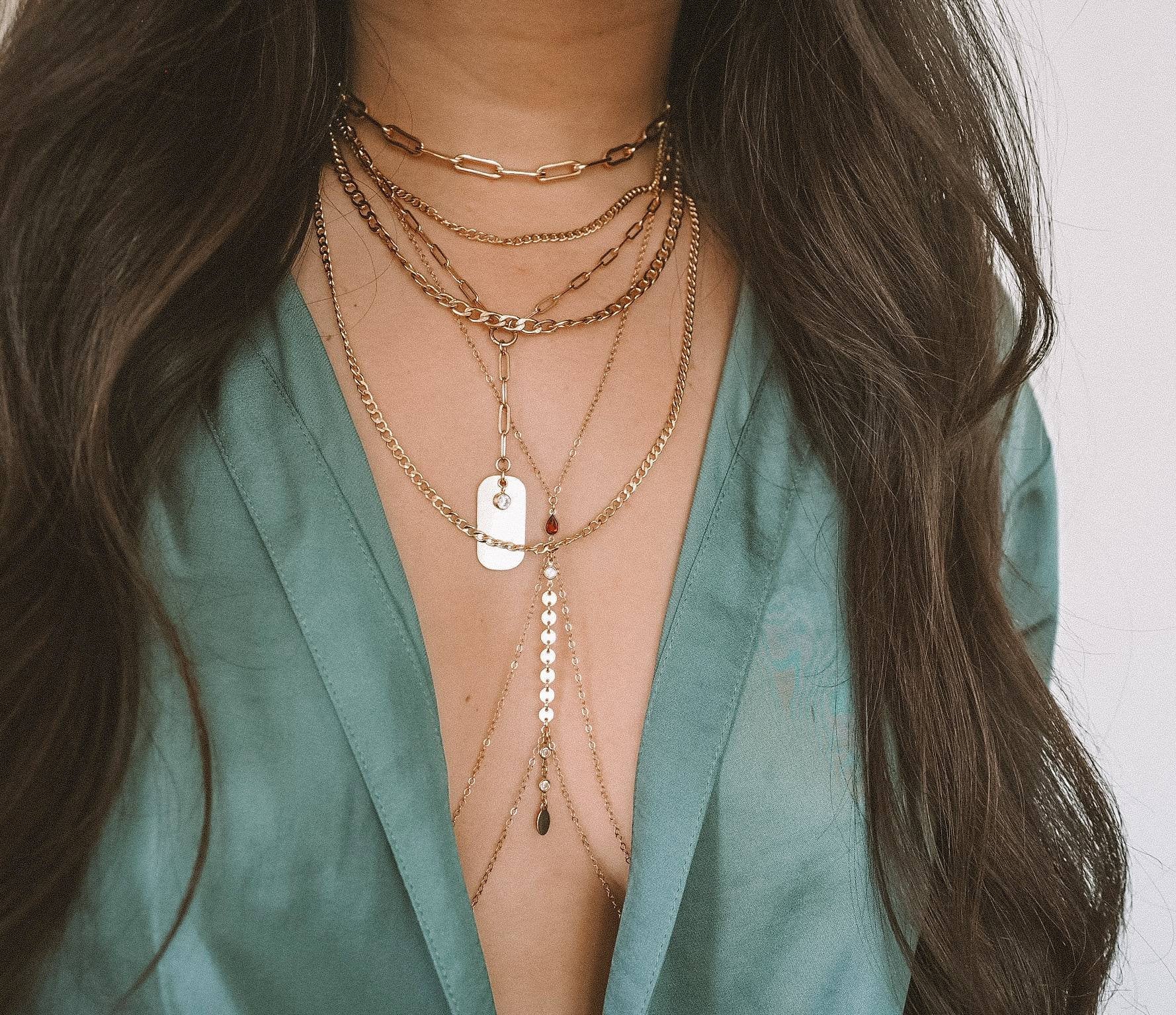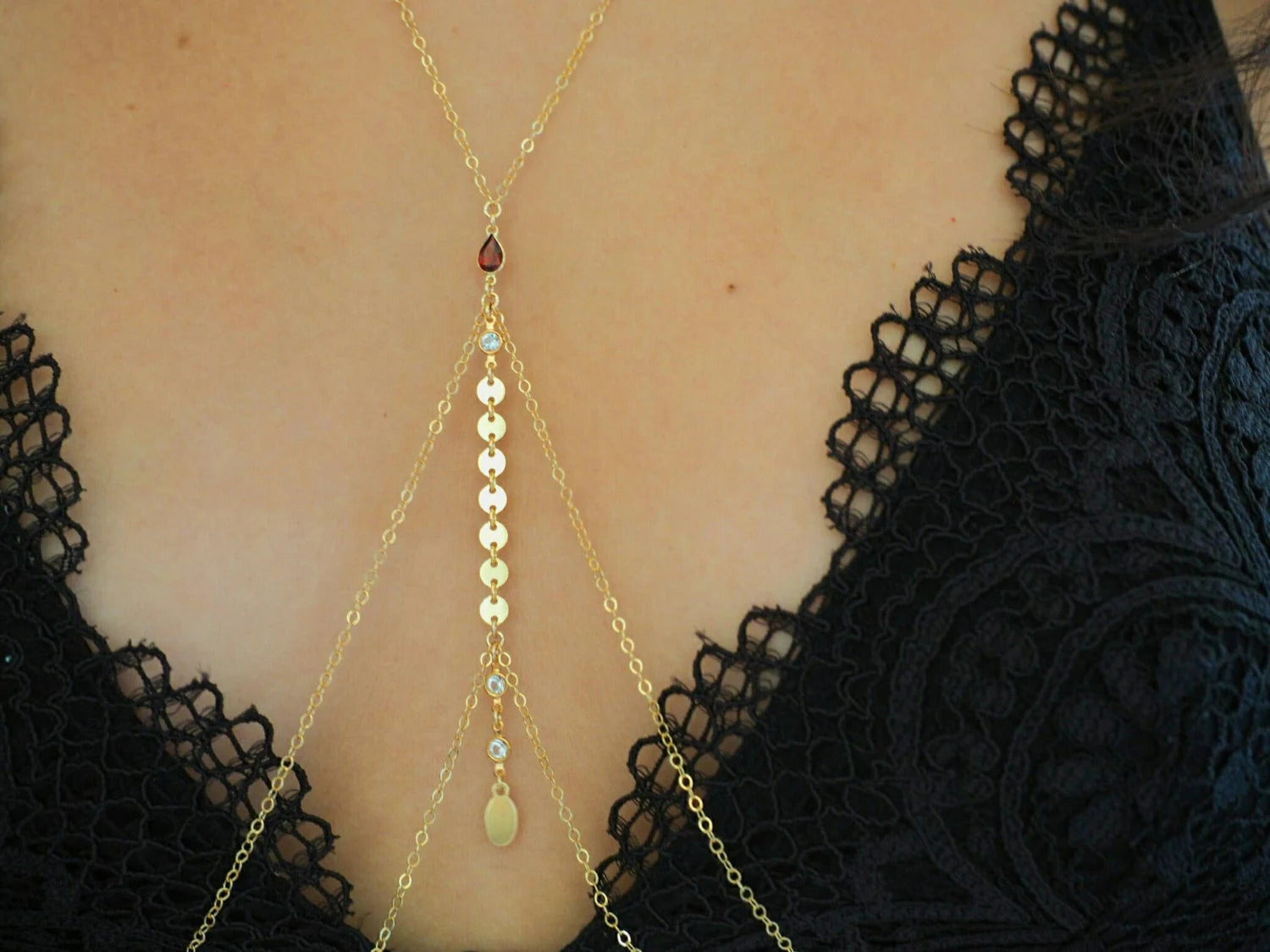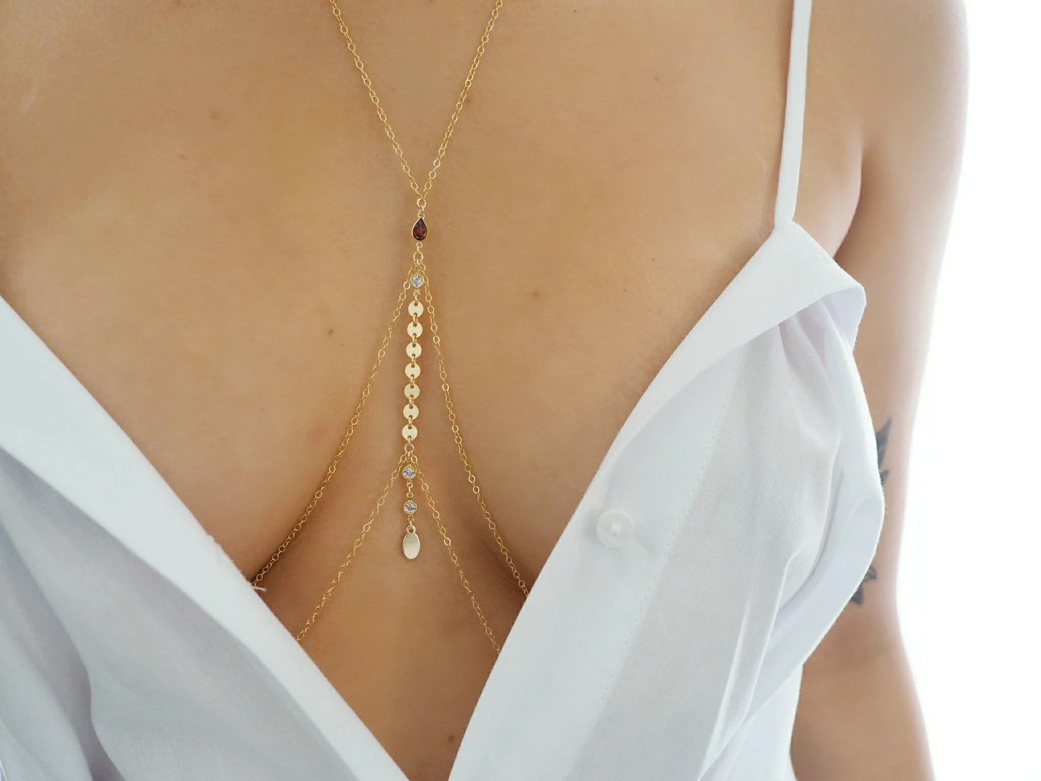 14k Gold Filled with 14k Solid Gold GARNET Coin Double V Dainty Body Chain