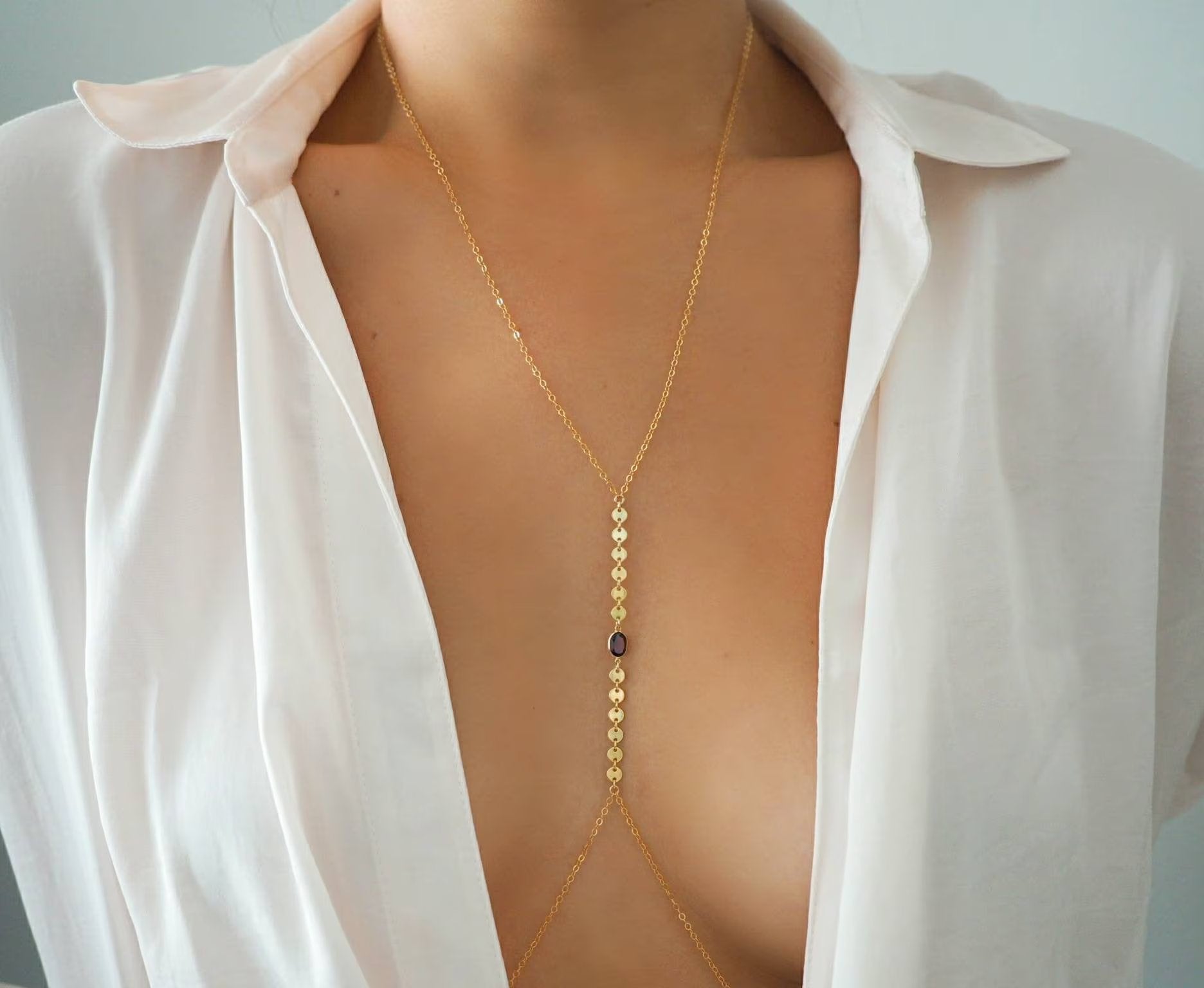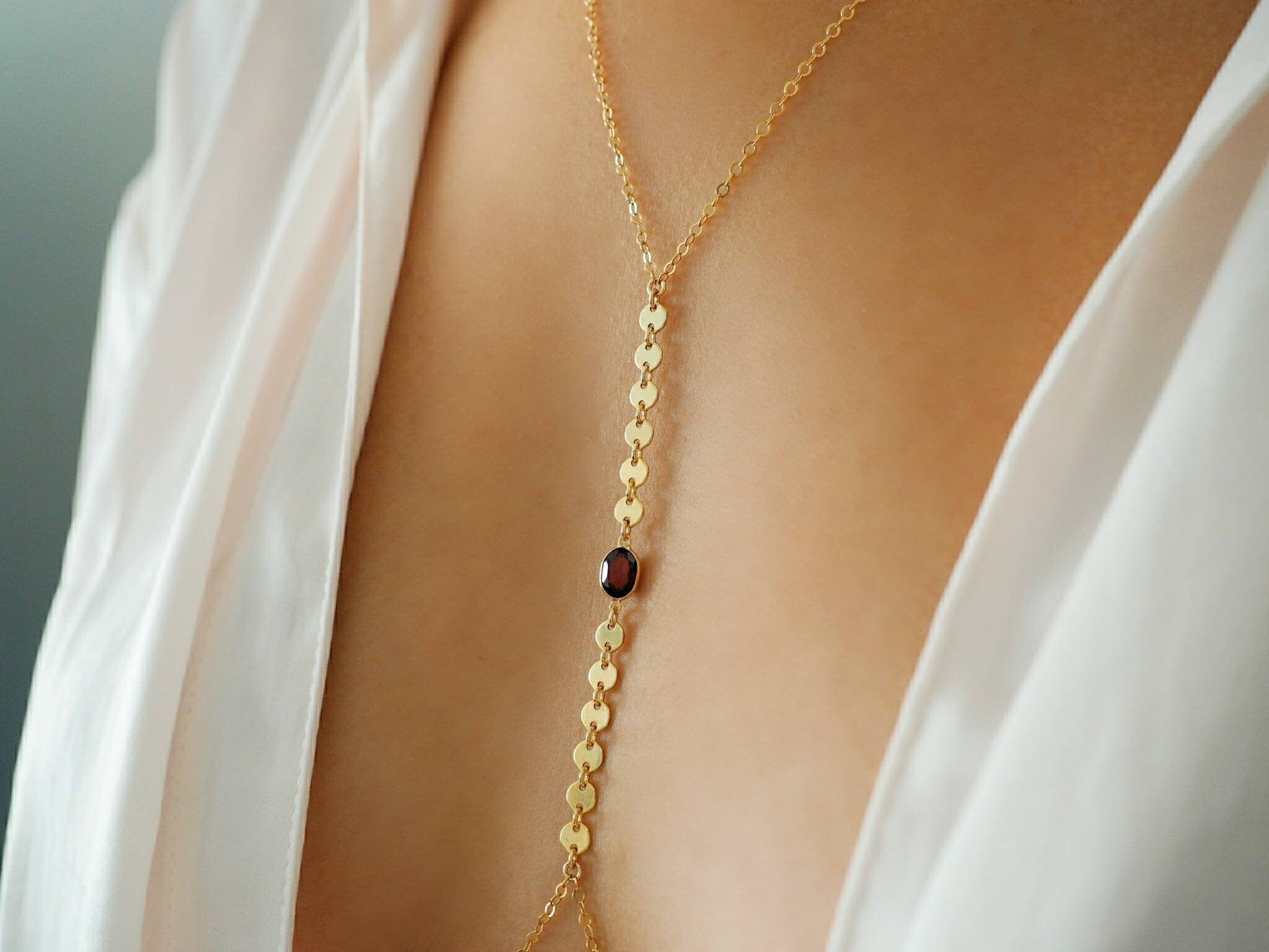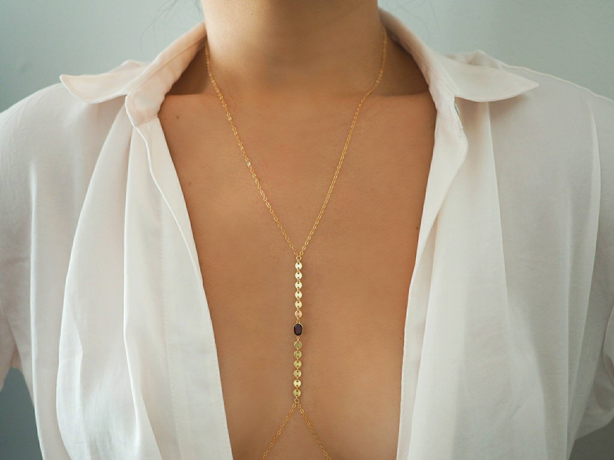 14k Gold Filled with 14k Solid Gold GARNET Oval Coin Line Dainty Body Chain