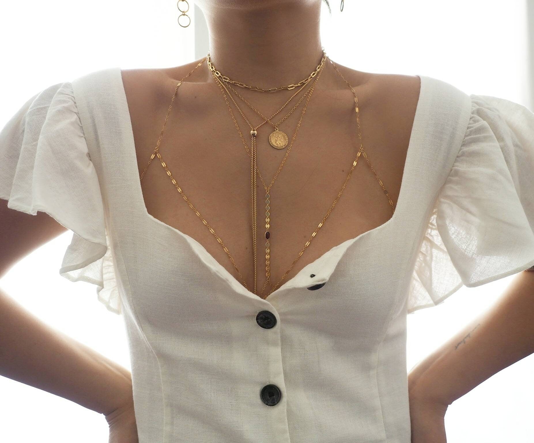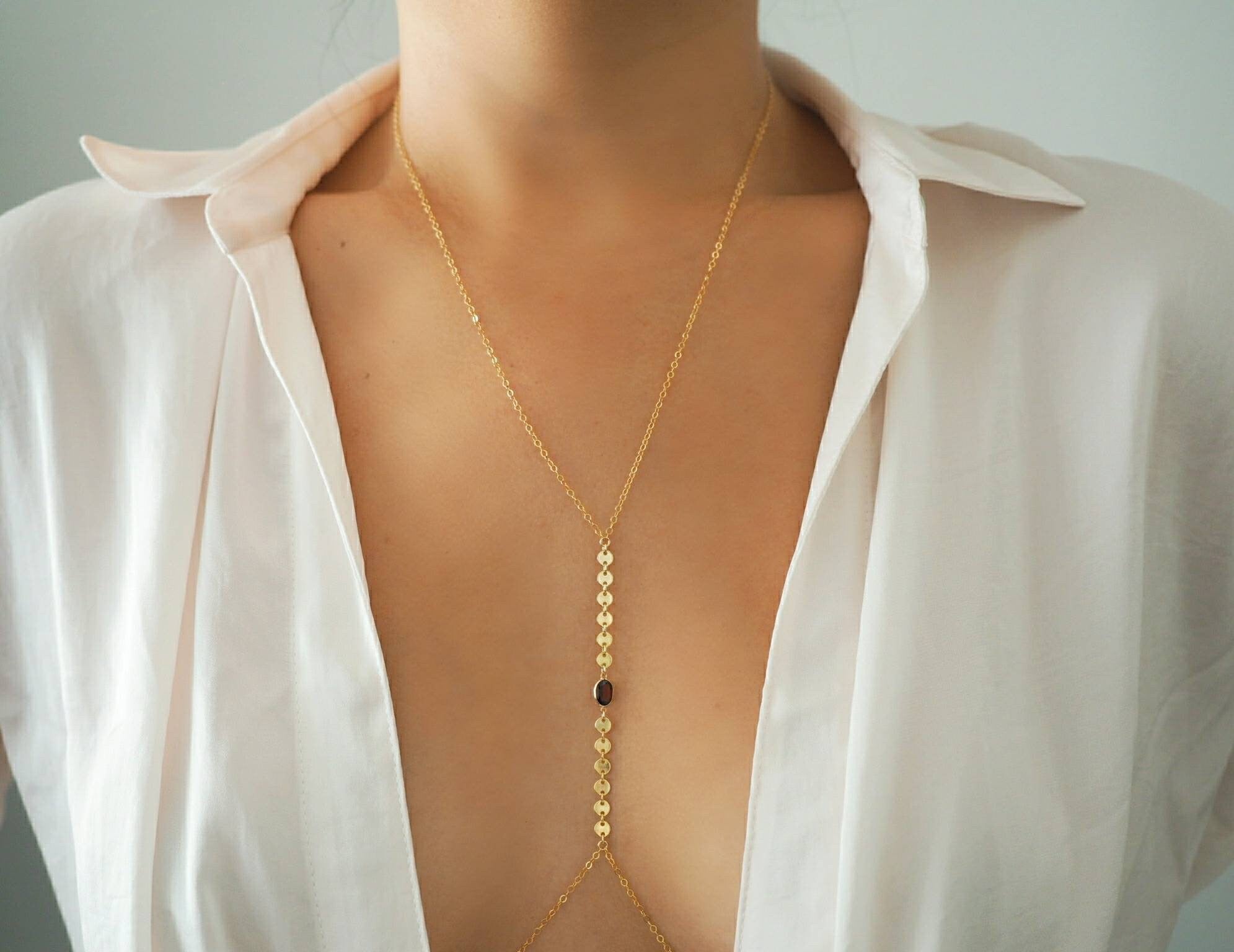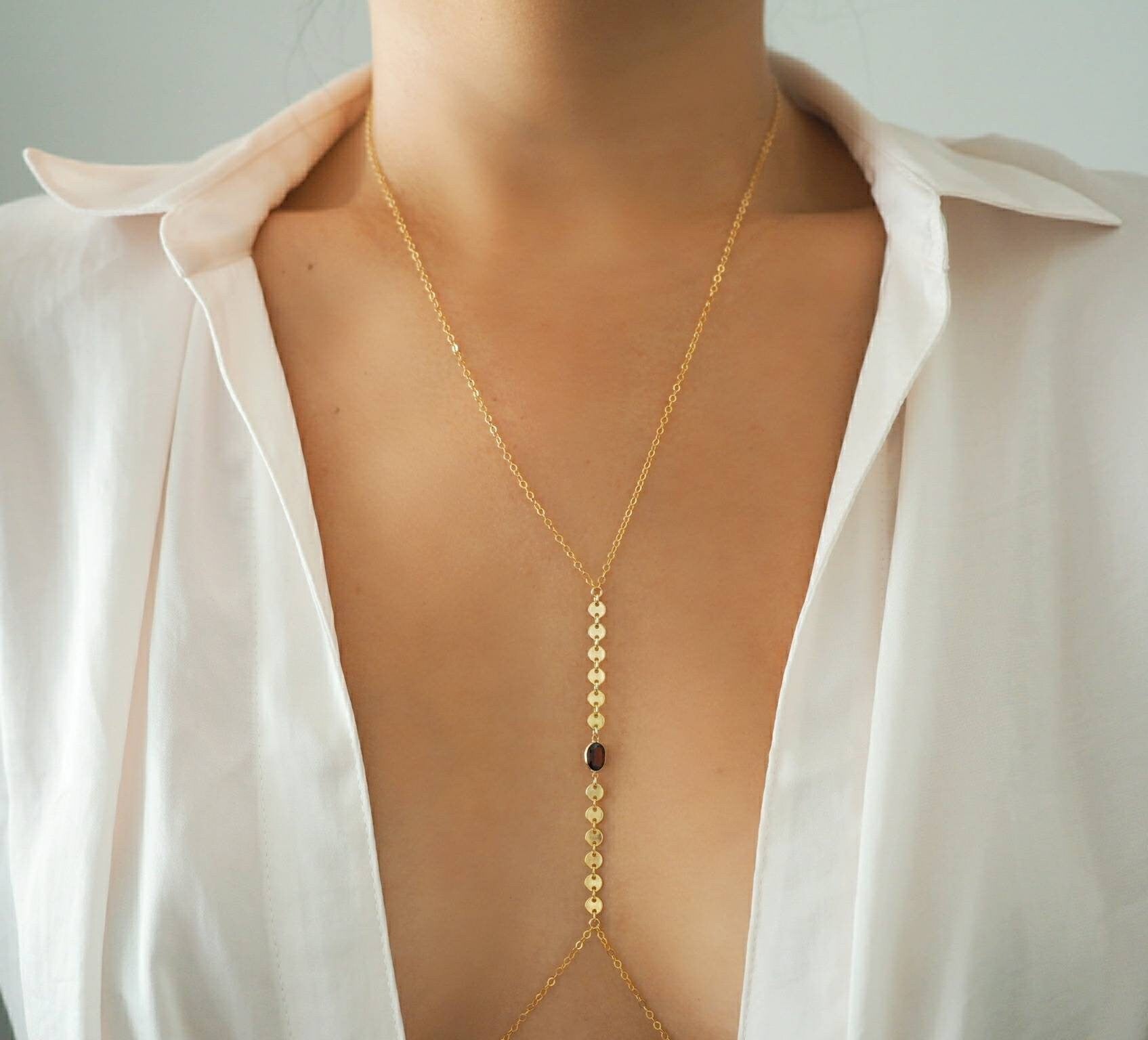 14k Gold Filled with 14k Solid Gold GARNET Oval Coin Line Dainty Body Chain
