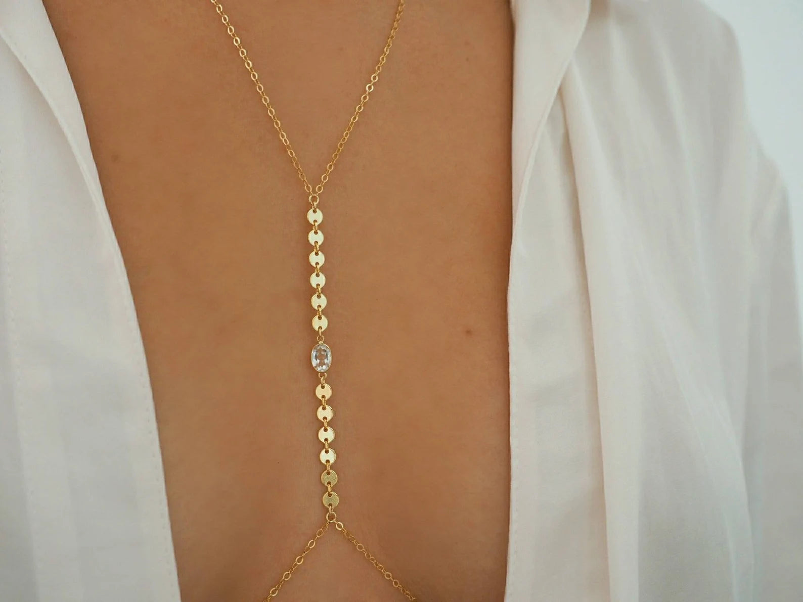14k Gold Filled with 14k Solid Gold WHITE TOPAZ Oval Coin Line Dainty Body Chain