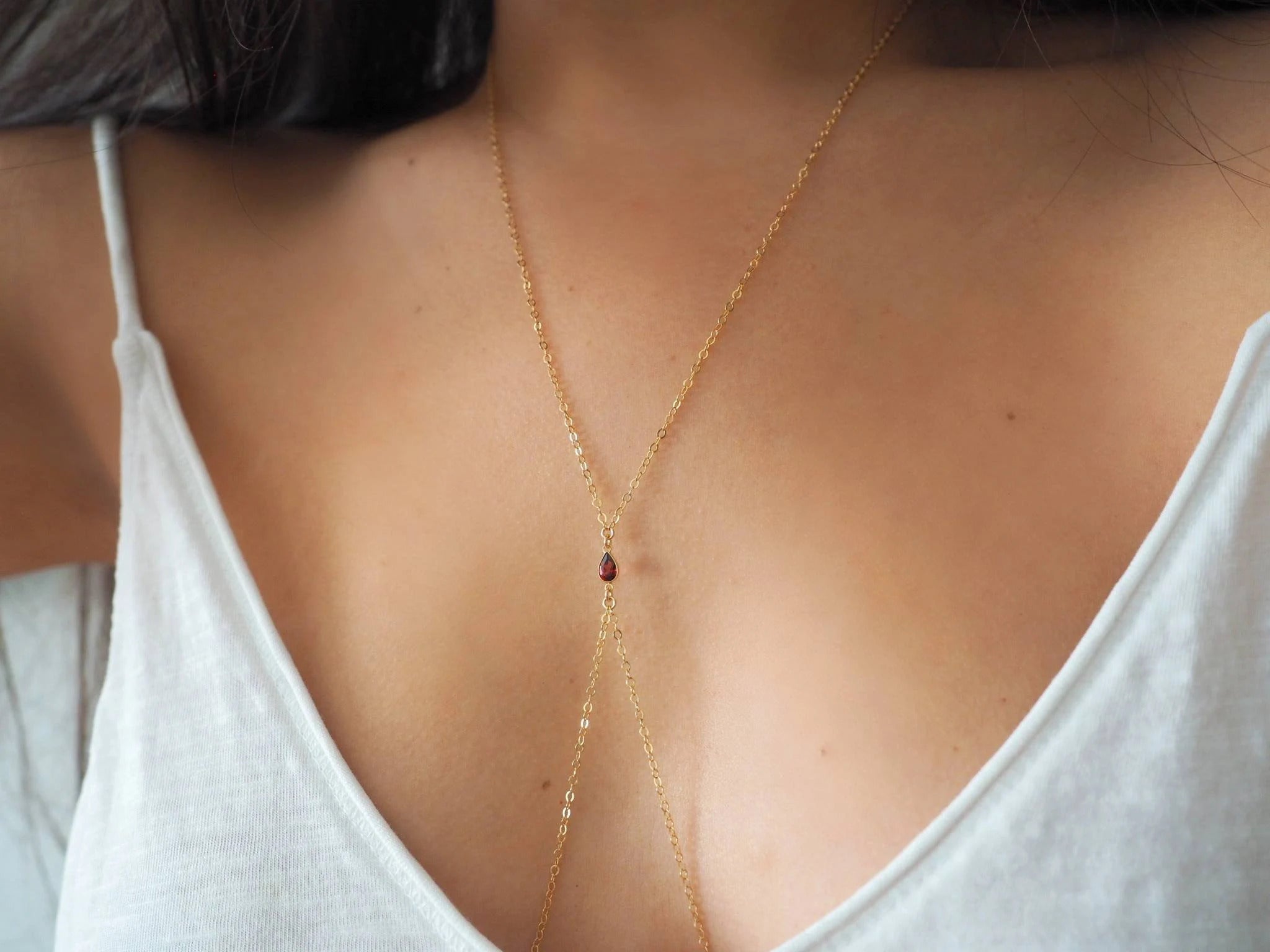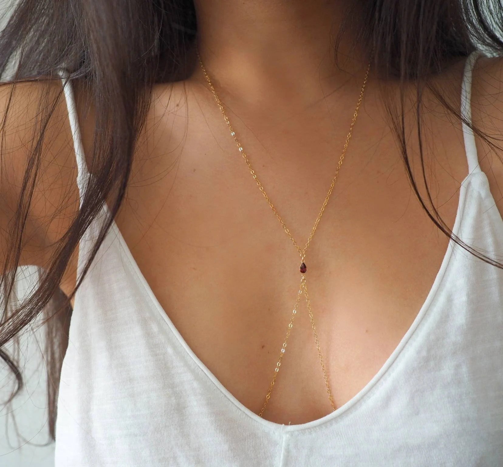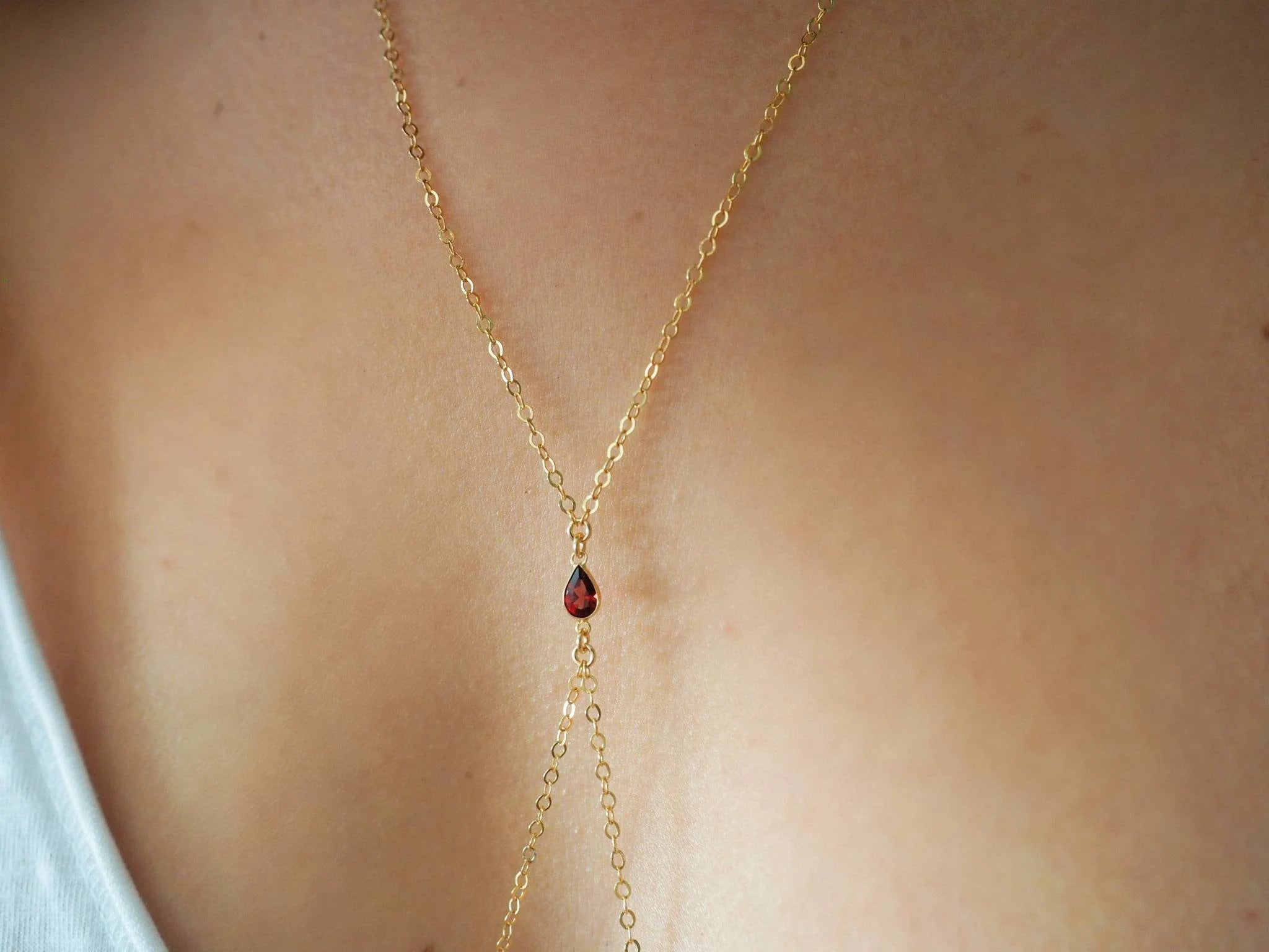 14k Gold Filled with Pear Shaped 14k Solid Gold Garnet Dainty Body Chain