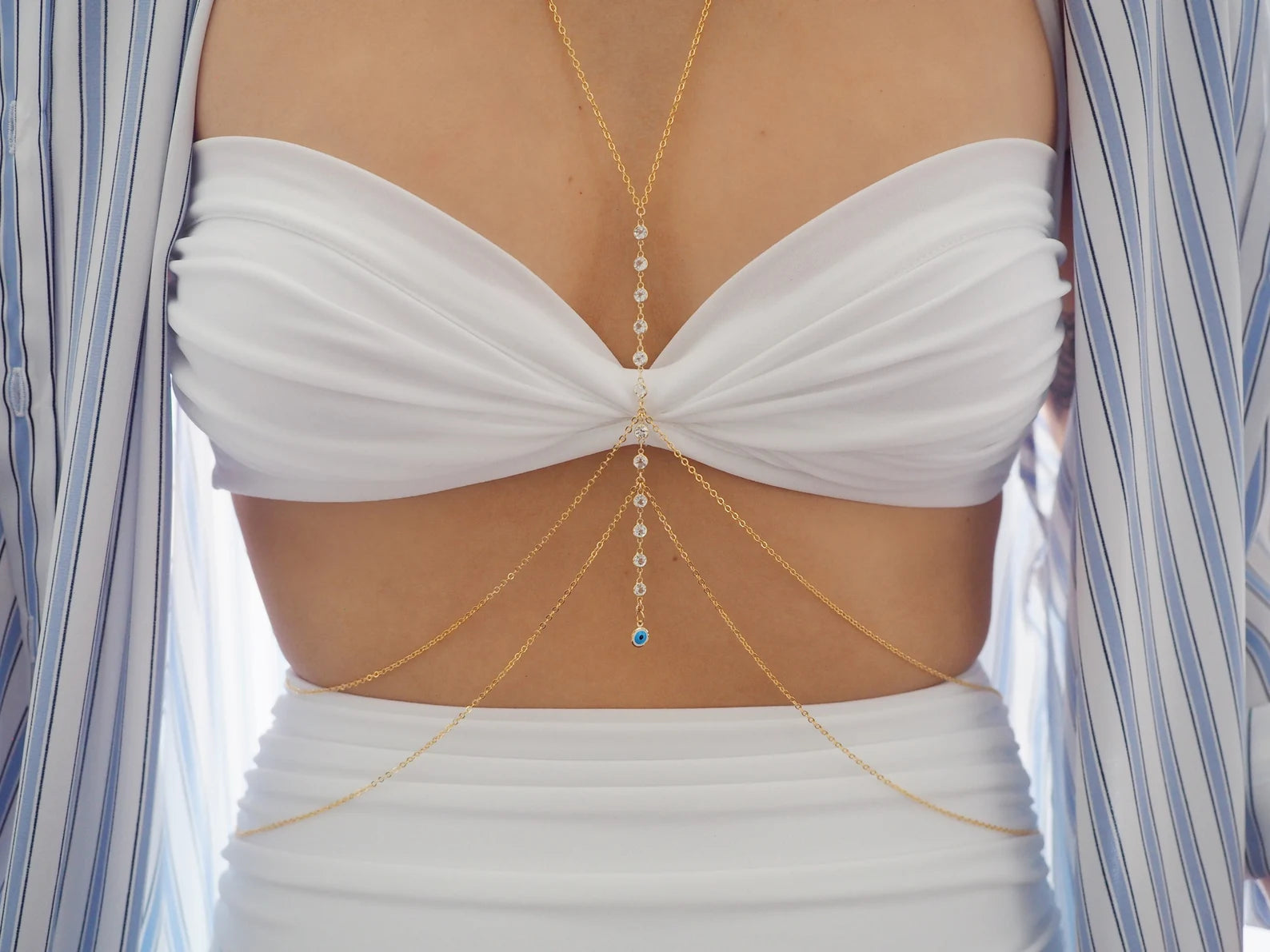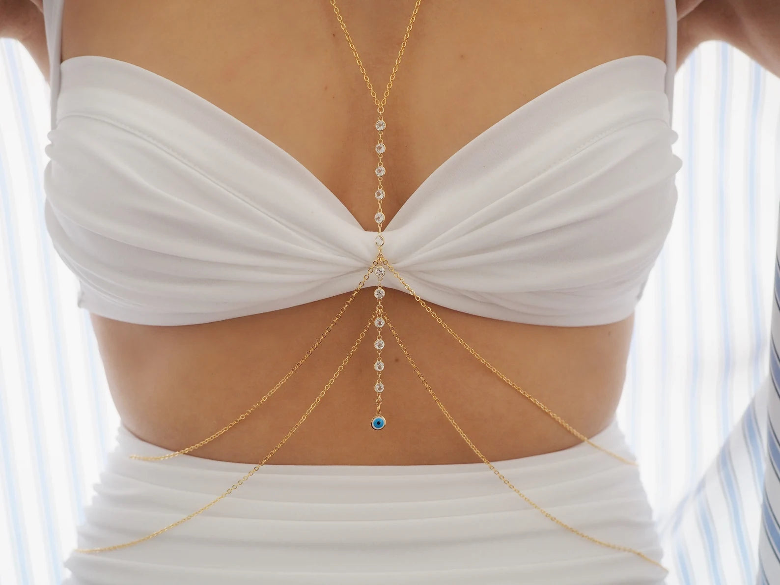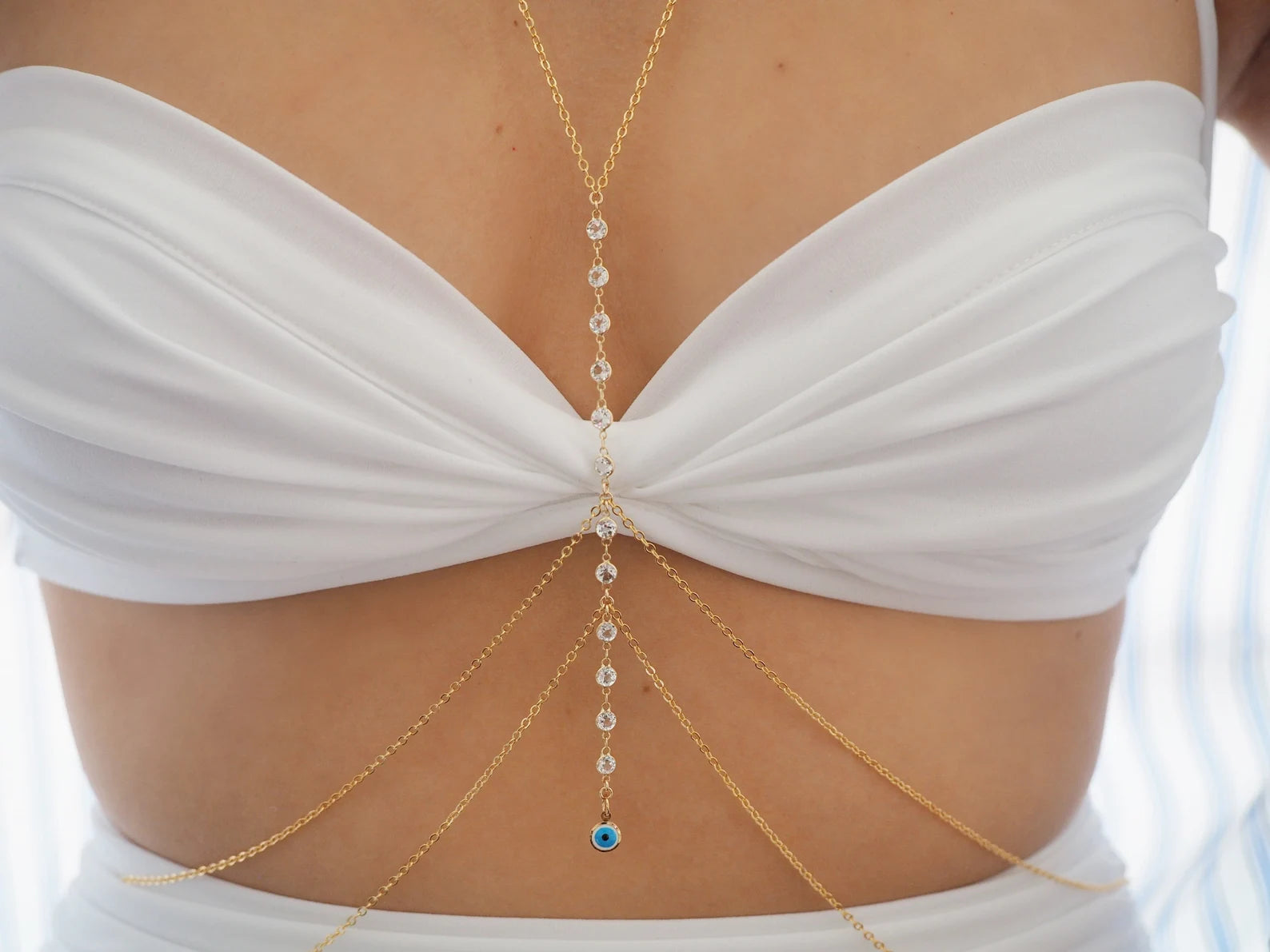 VERSION 2.0 | 14k Gold Filled with 14k Solid Gold White Topaz Evil Eye Dainty Double Layer Body Chain
