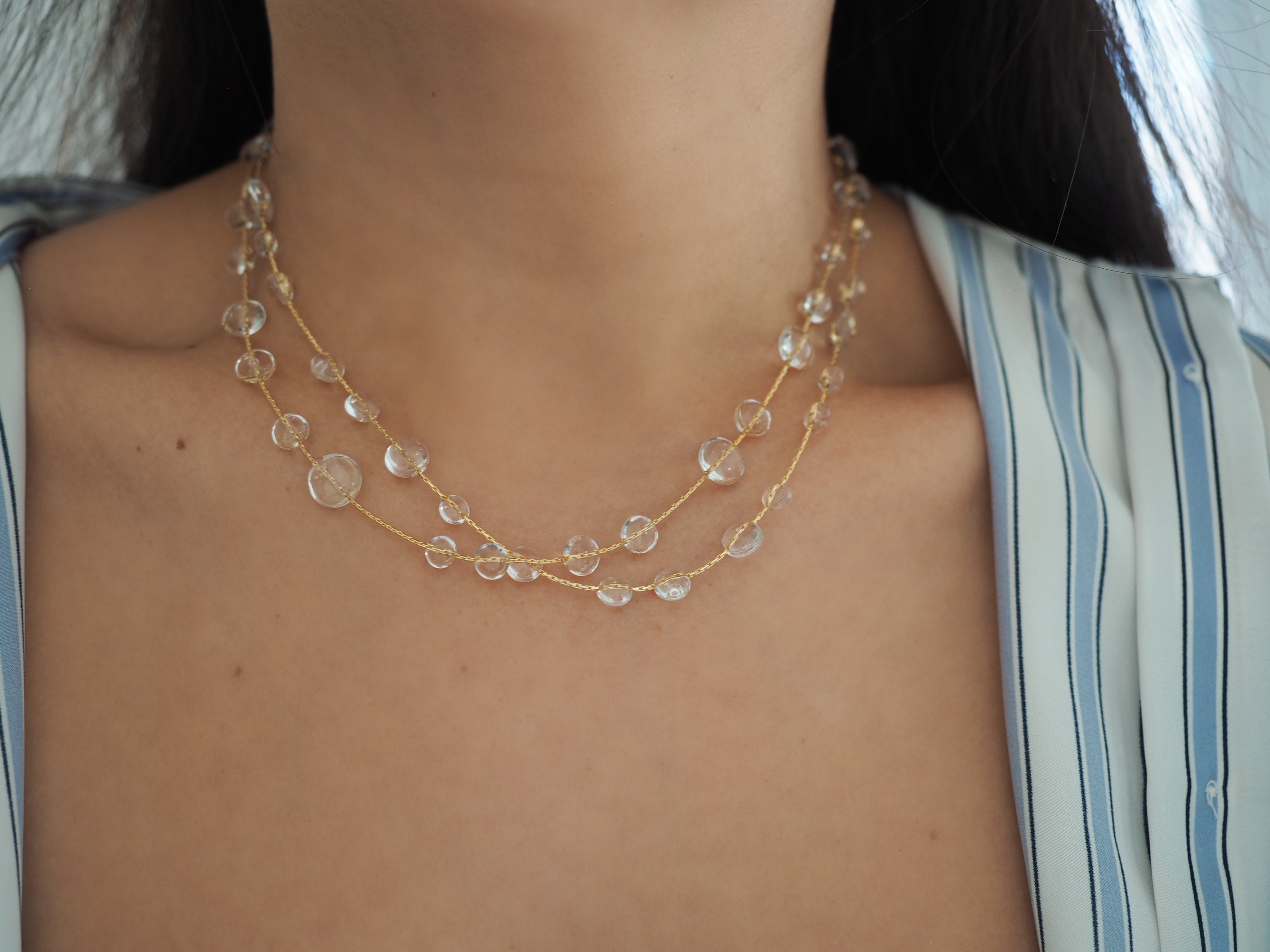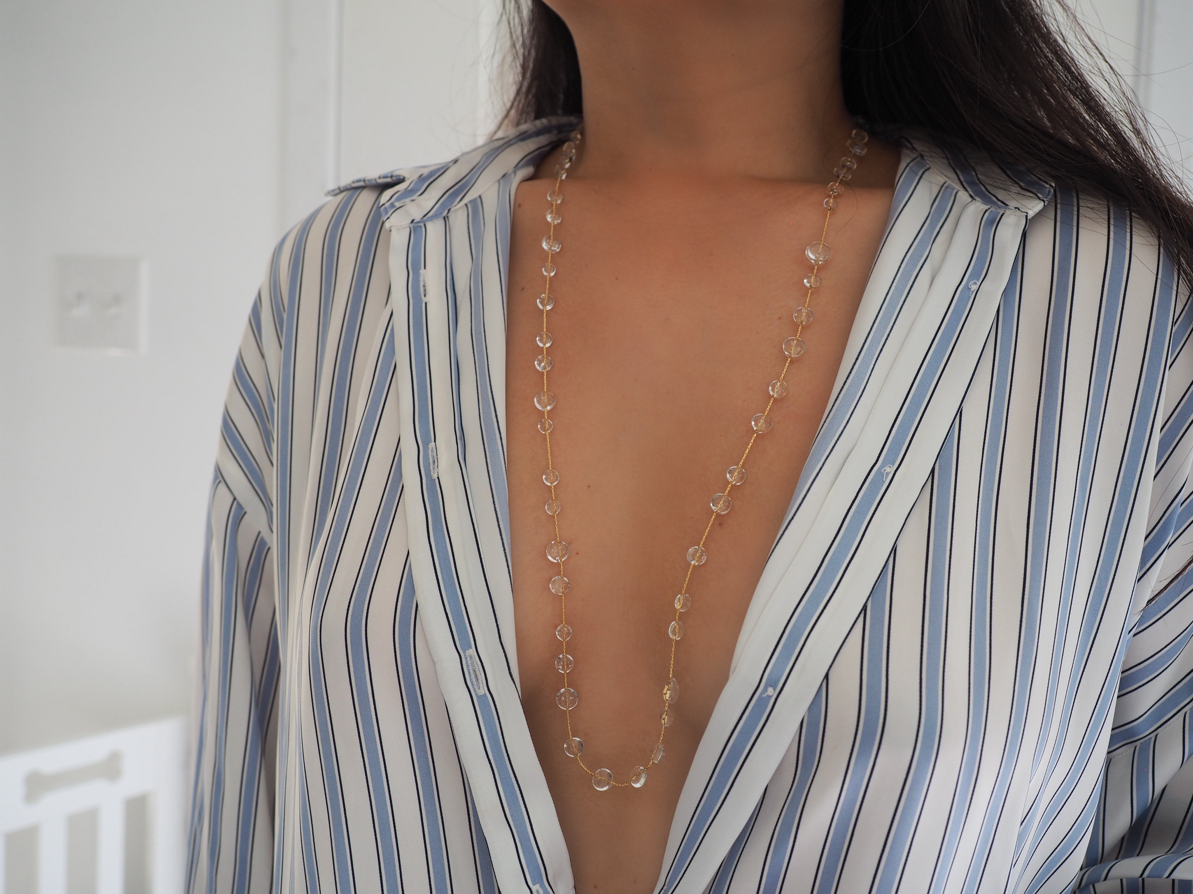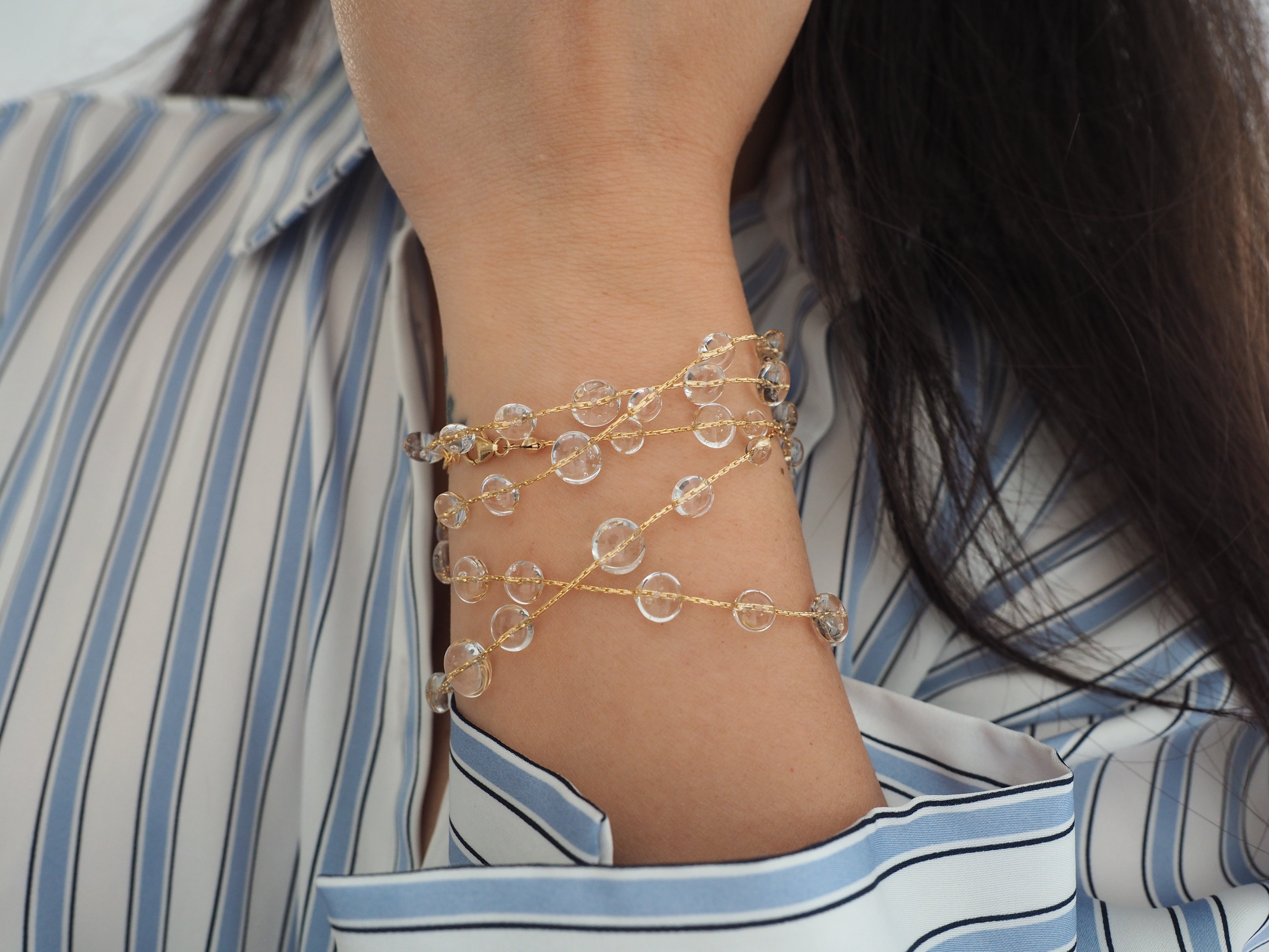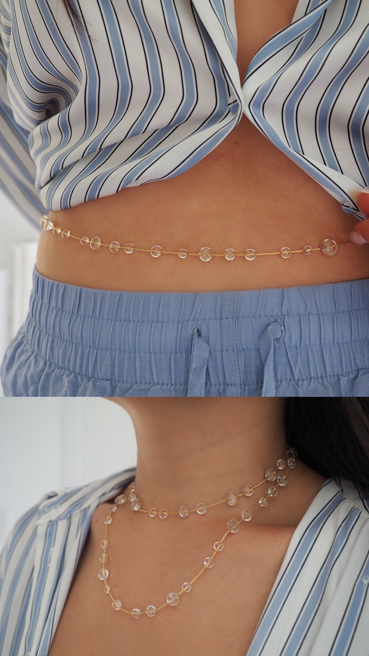Dew drops mixed with gold, this beautiful piece can be worn in multiple ways! As a belly chain, long necklace, double layer necklace, wrap bracelet, and even wrap anklet!