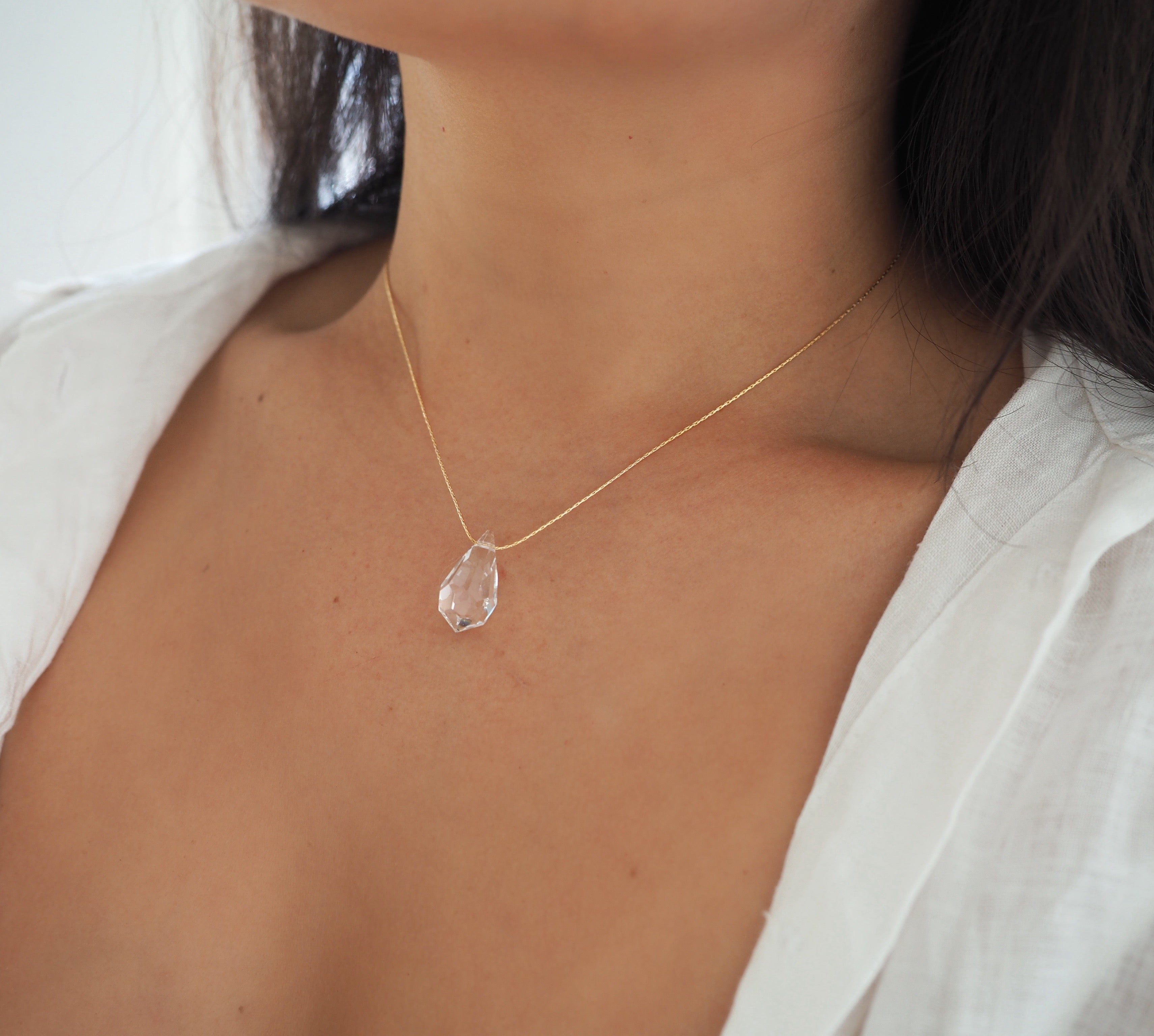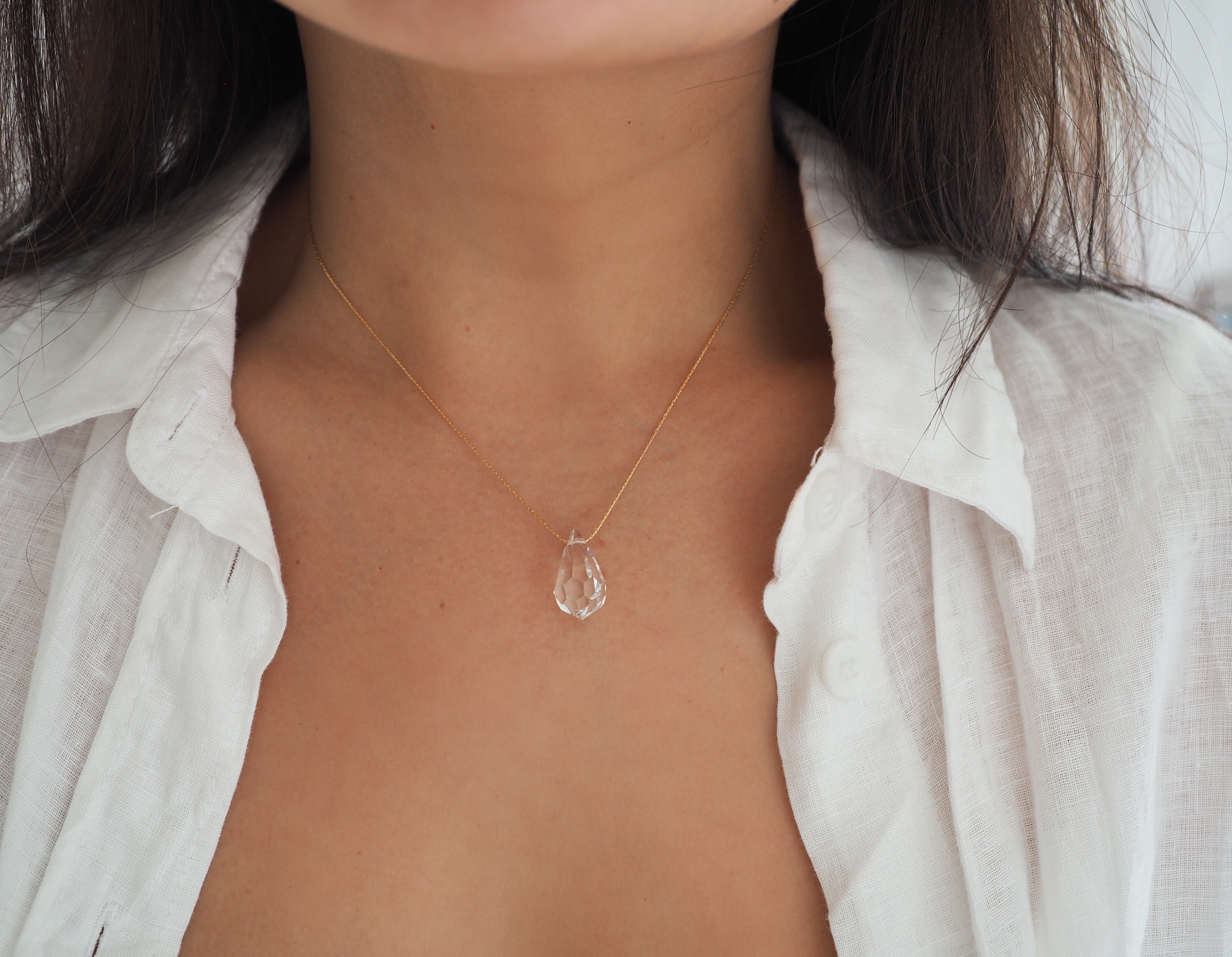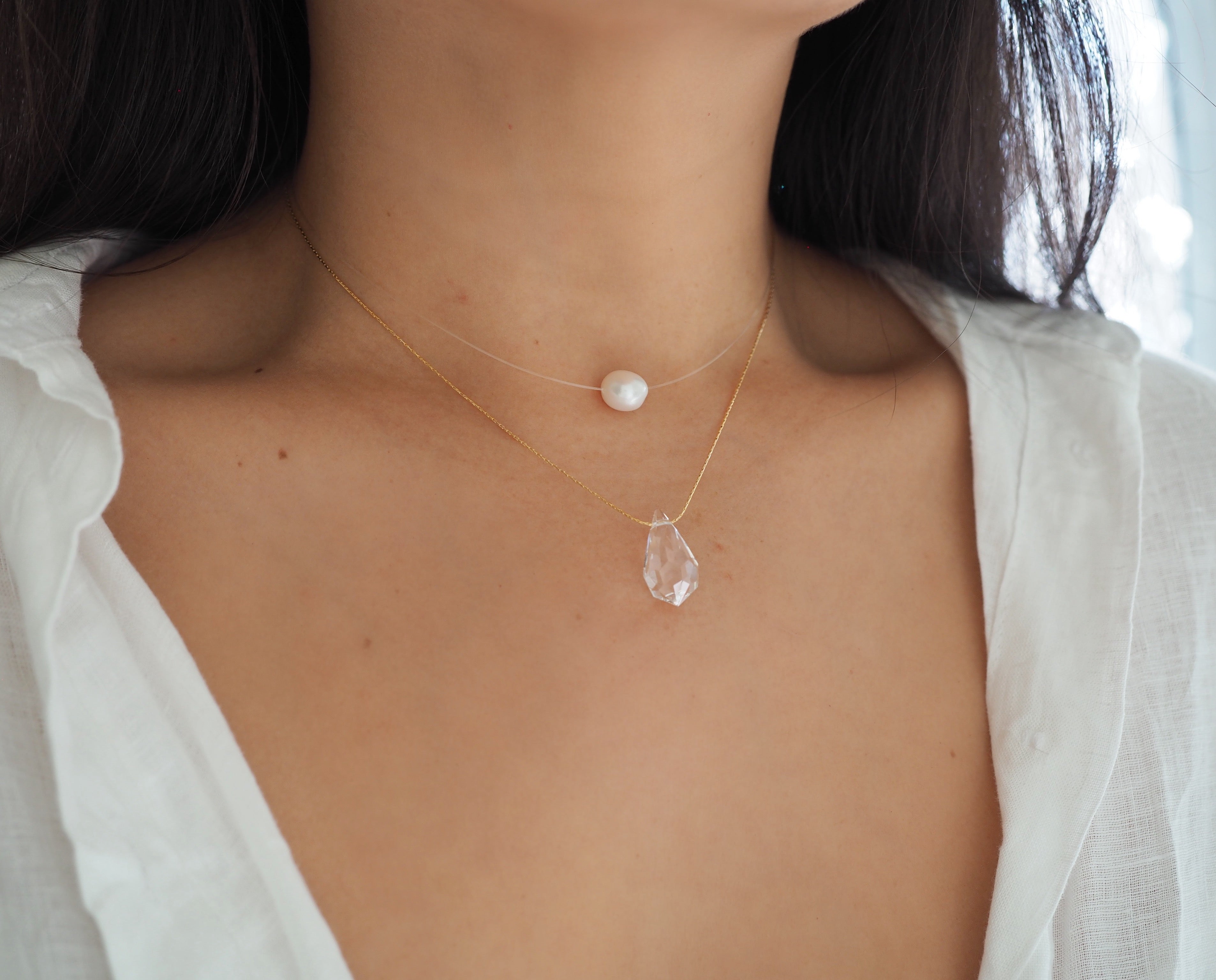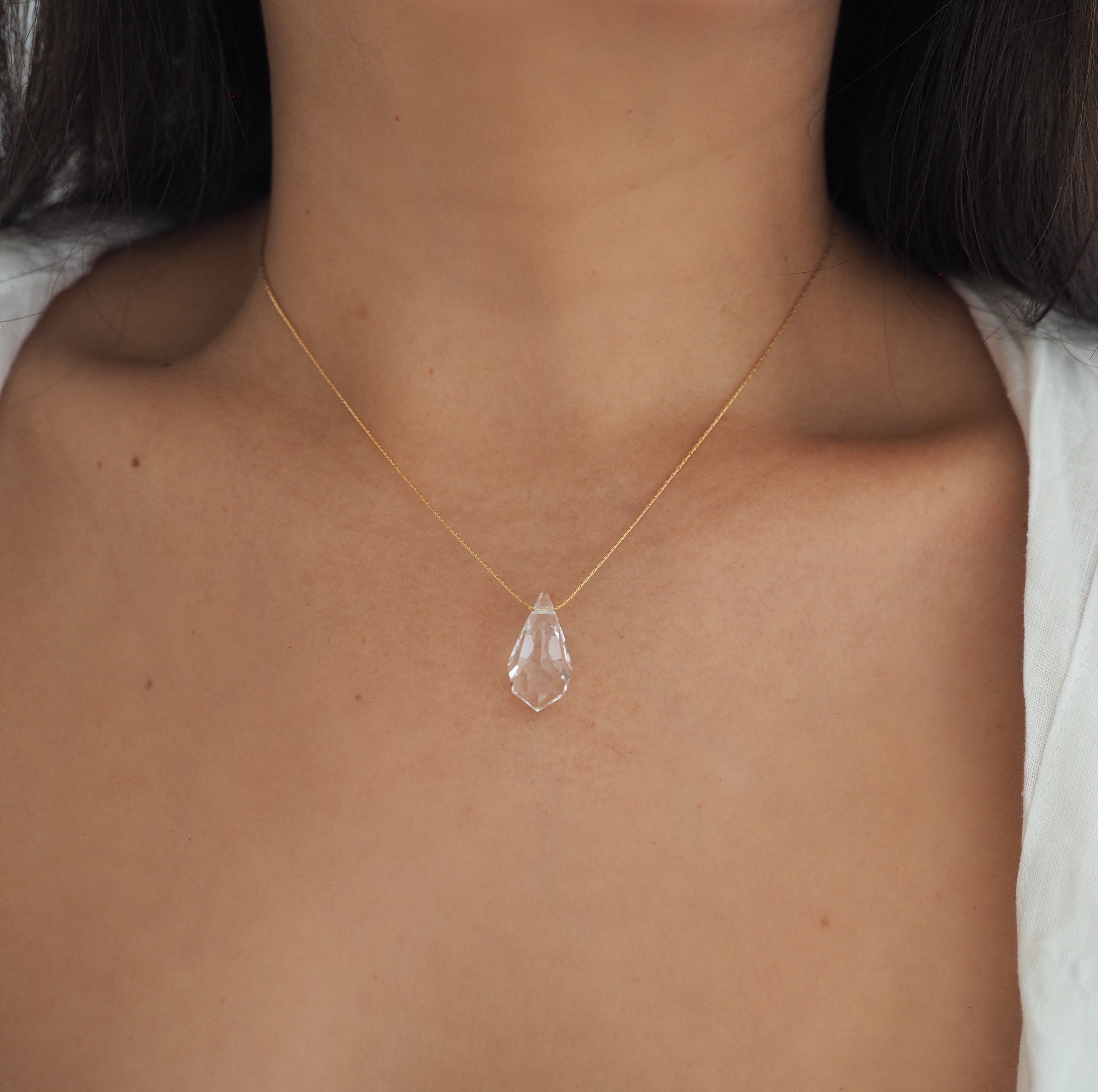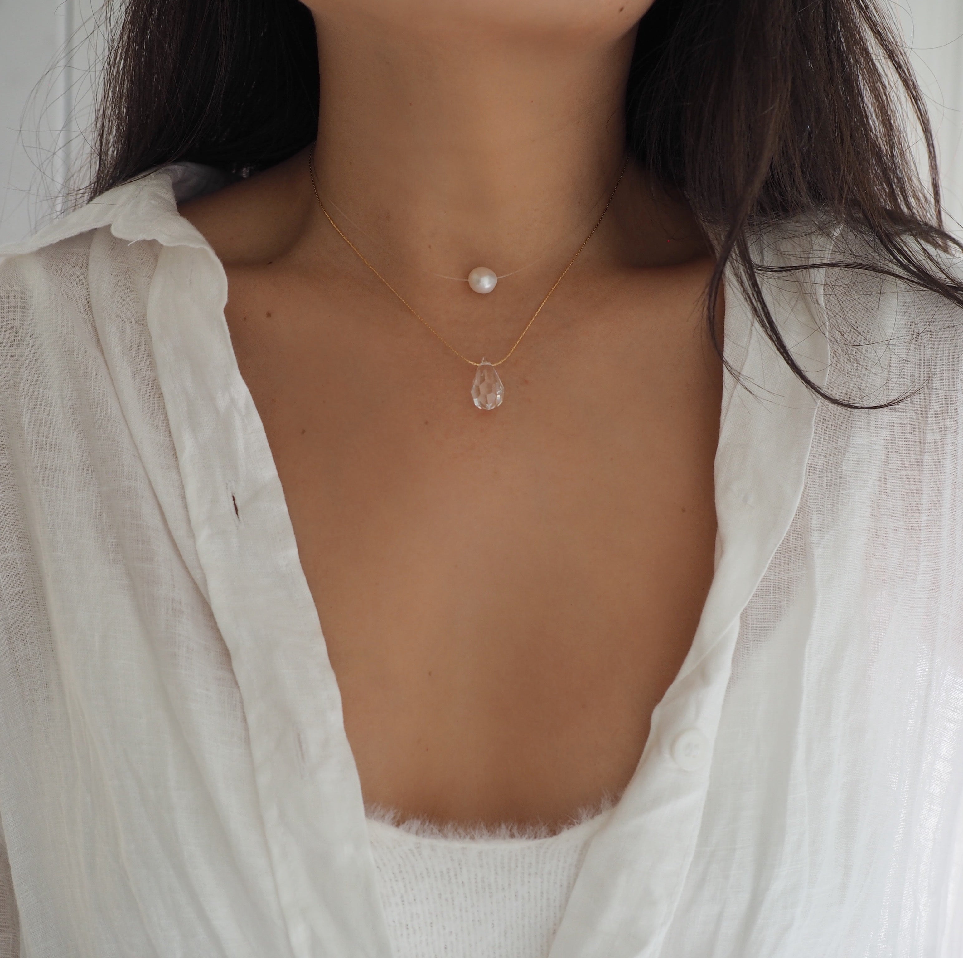 The “floating crystal drop” necklace is beautifully minimalistic featuring a single crystal teardrop strung on dainty gold filled chain. Looks amazing paired together with the Floating Freshwater Pearl Necklace!