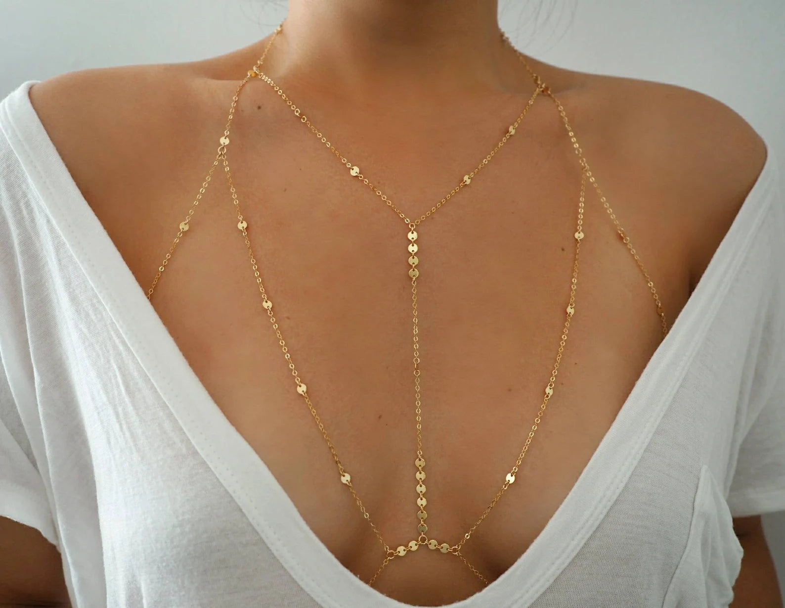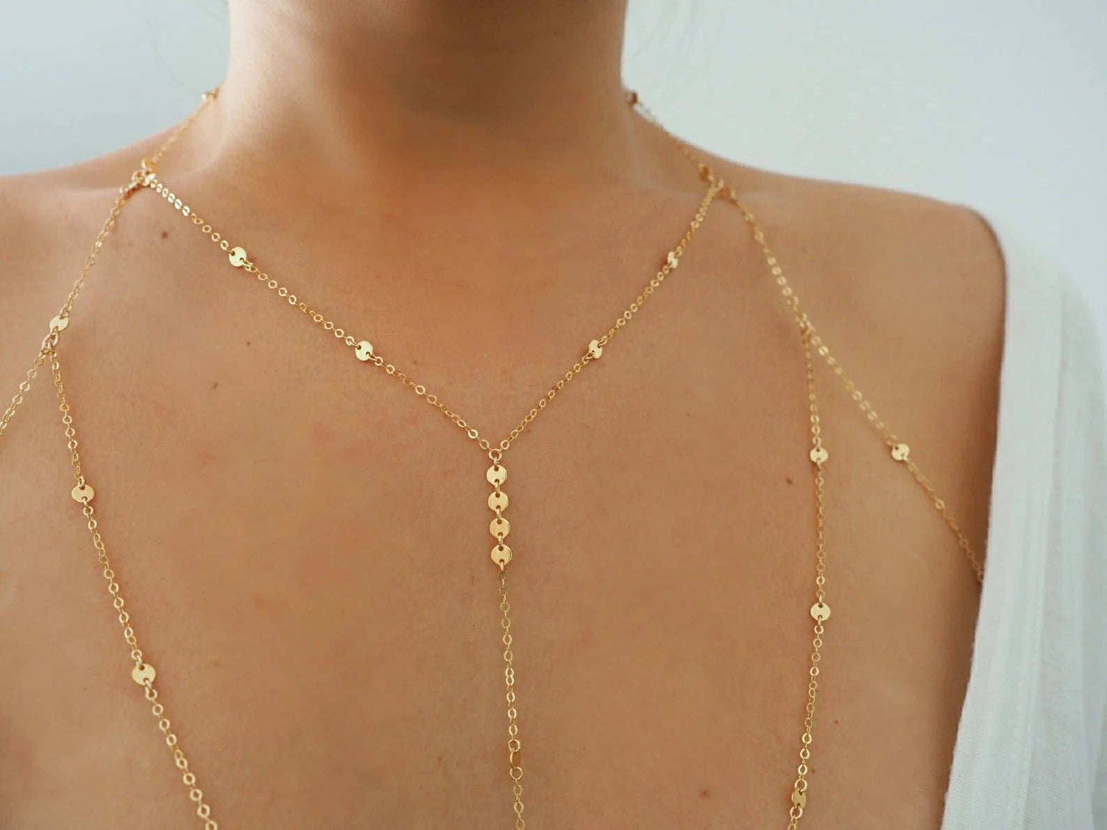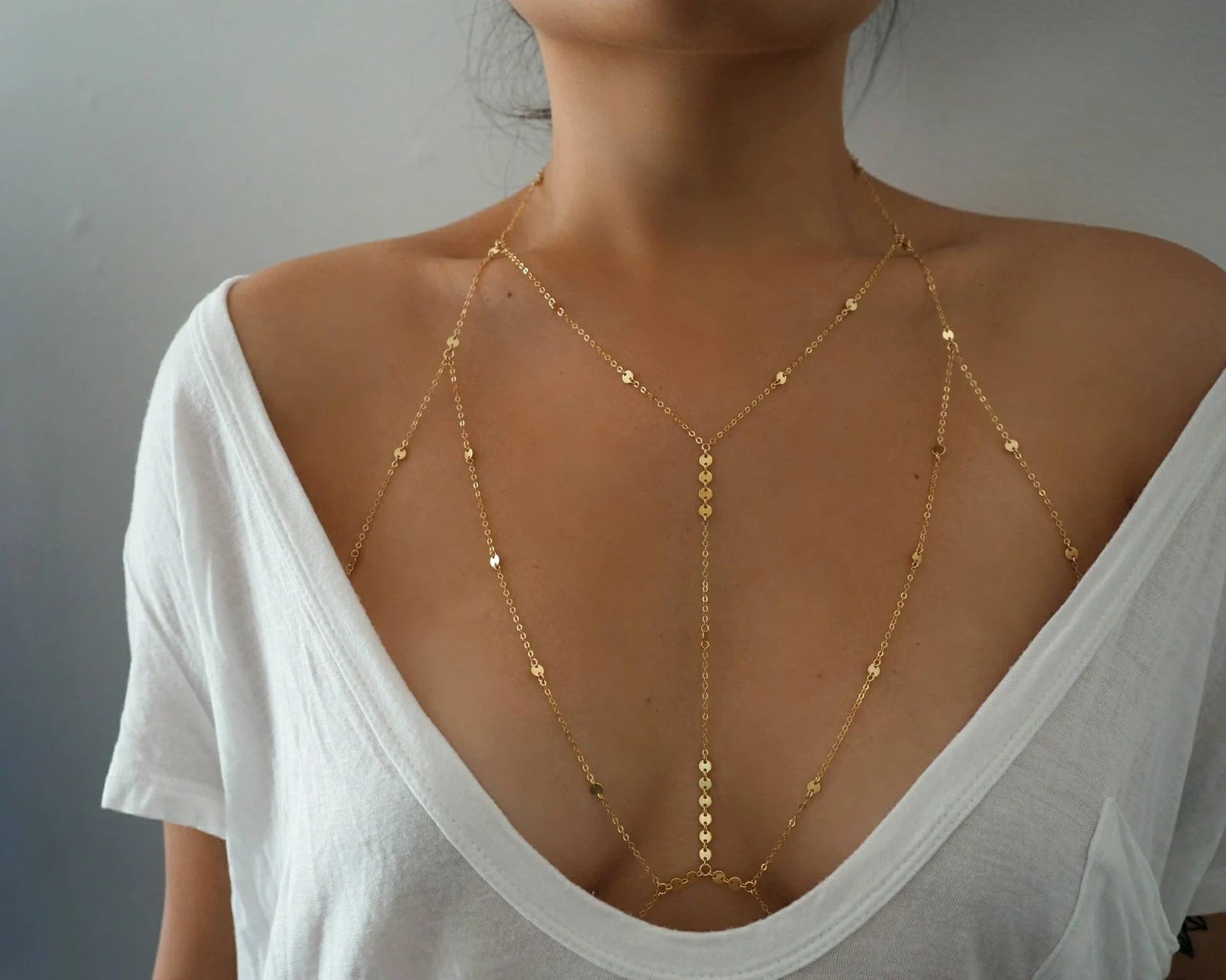14k Gold Filled Tiny Coins T-Row Dainty Chain Bralette Halter Top Body Chain