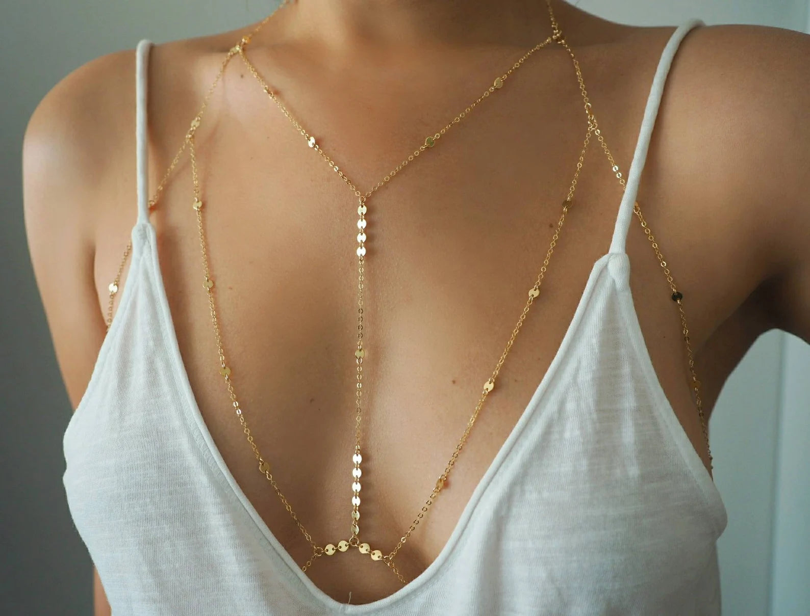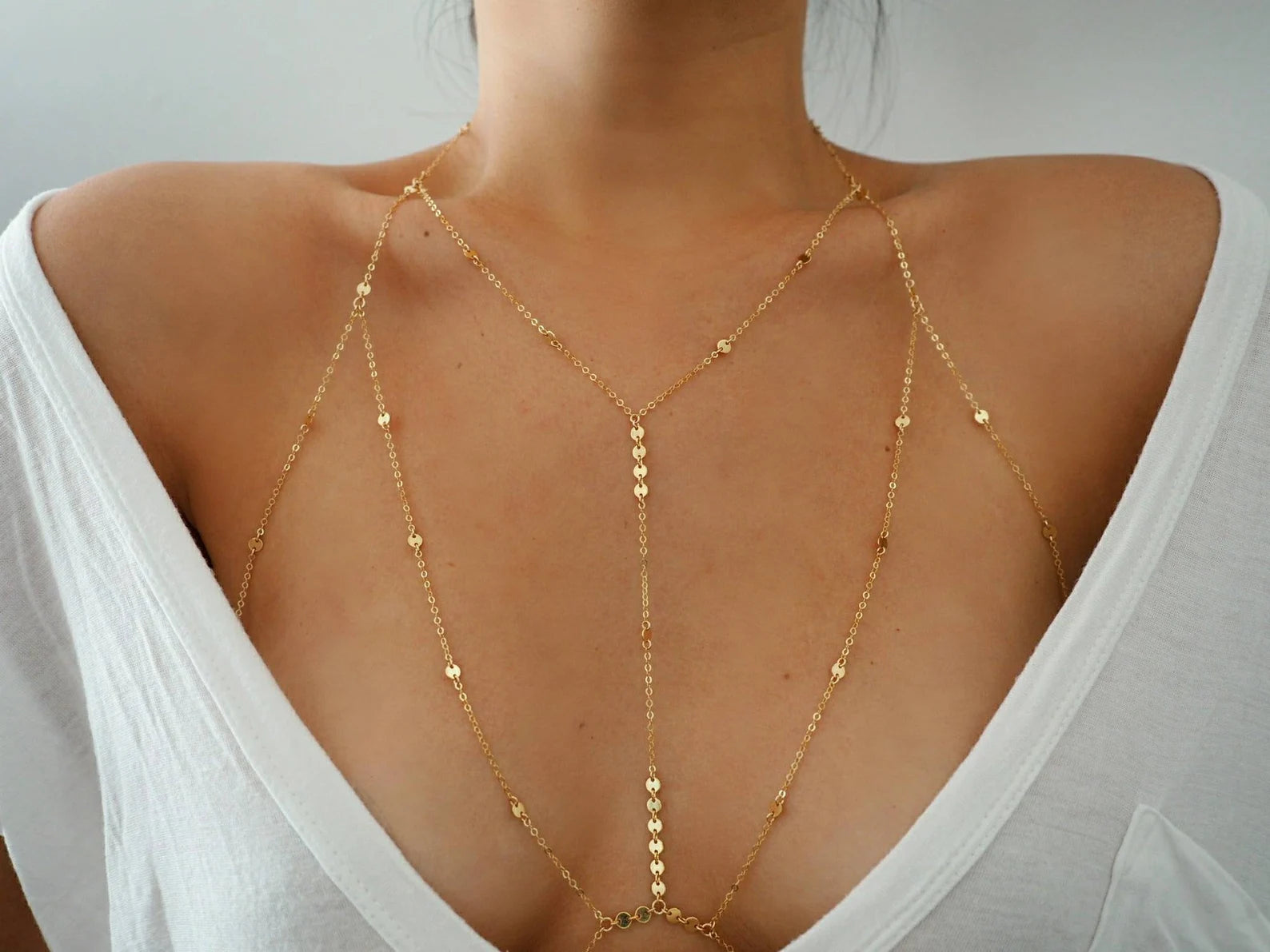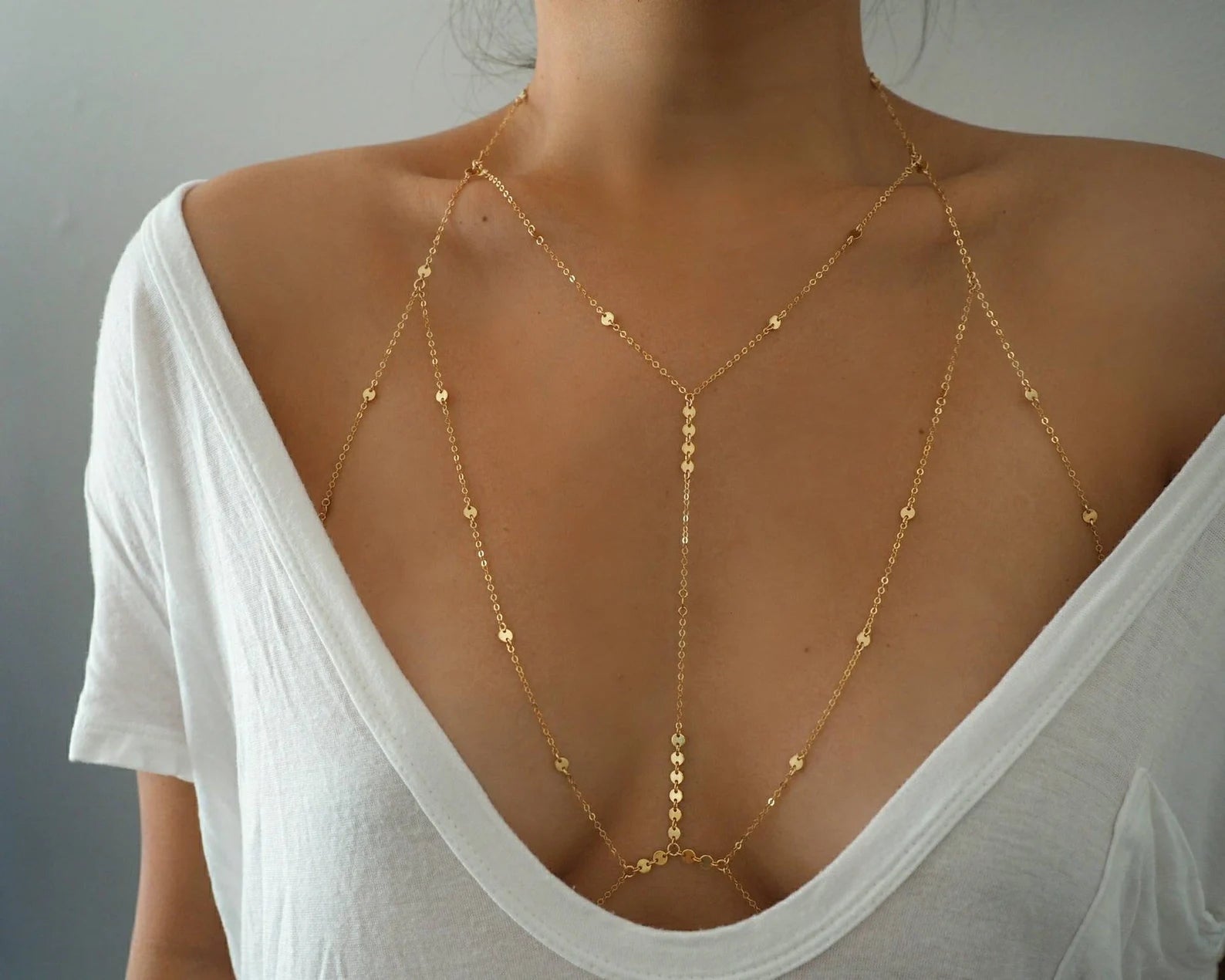 14k Gold Filled Tiny Coins T-Row Dainty Chain Bralette Halter Top Body Chain