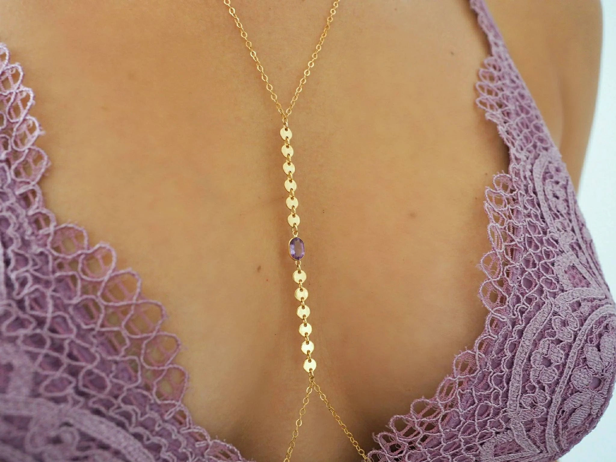 14k Gold Filled with 14k Solid Gold AMETHYST Oval Coin Line Dainty Body Chain