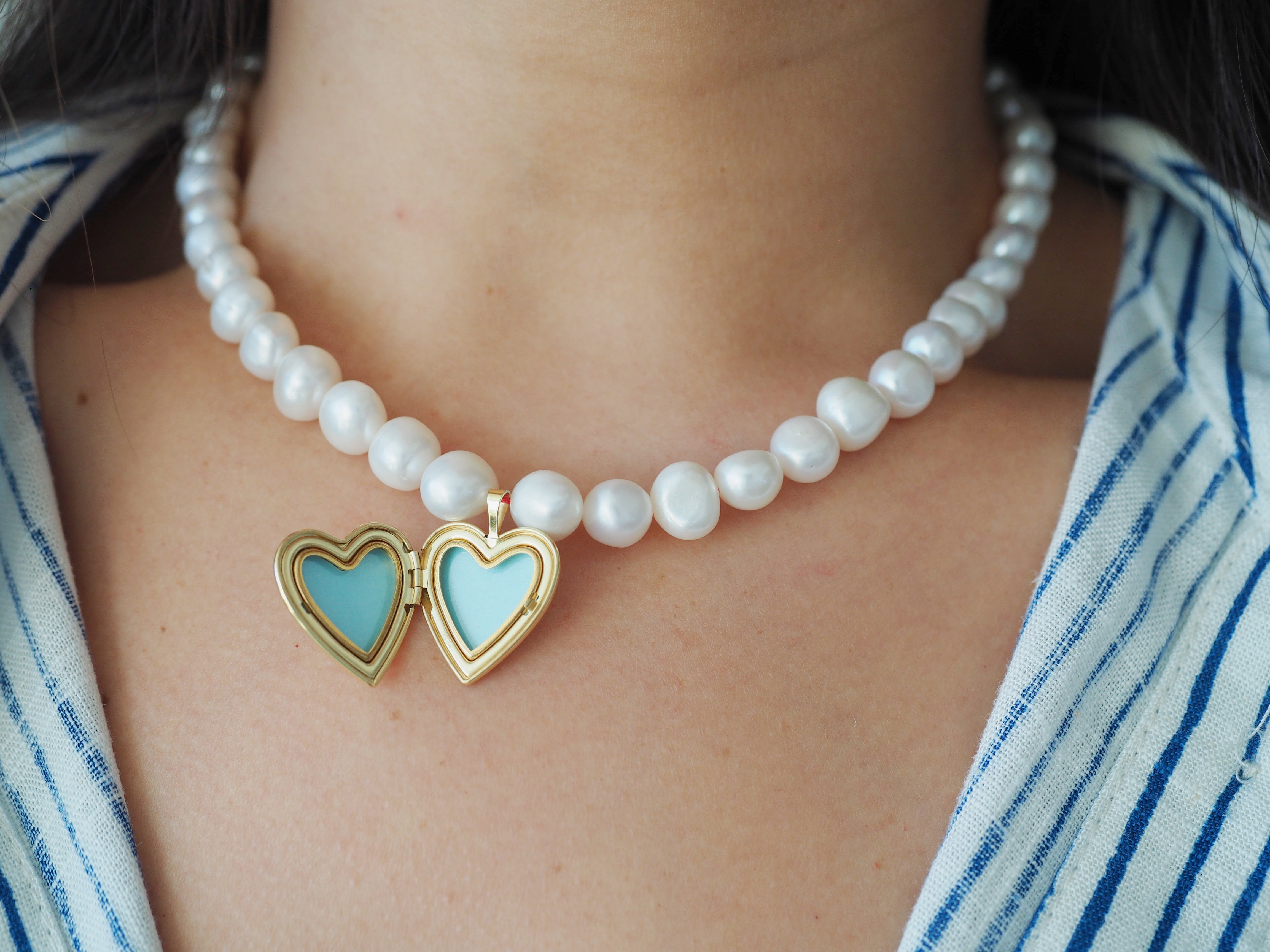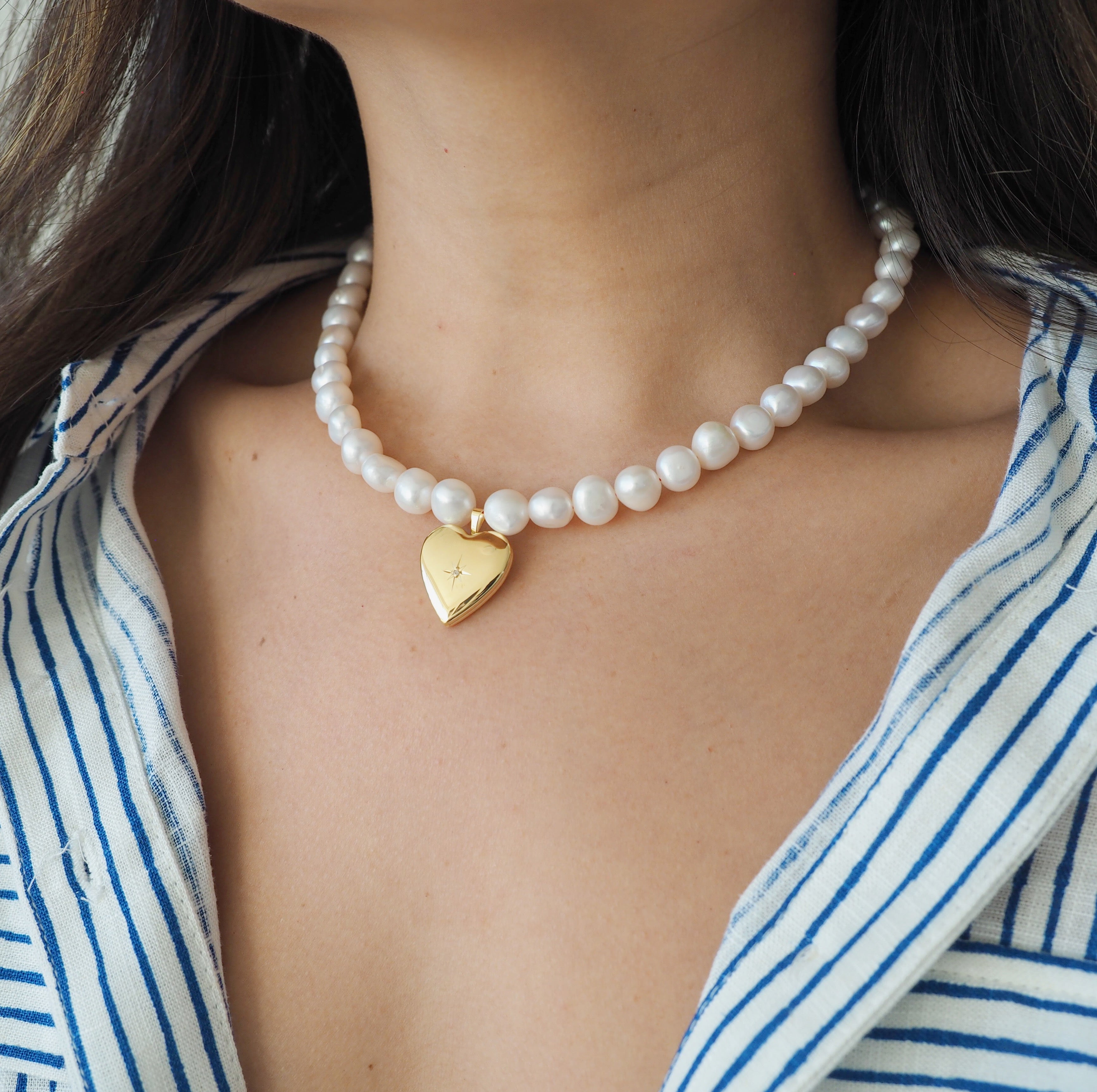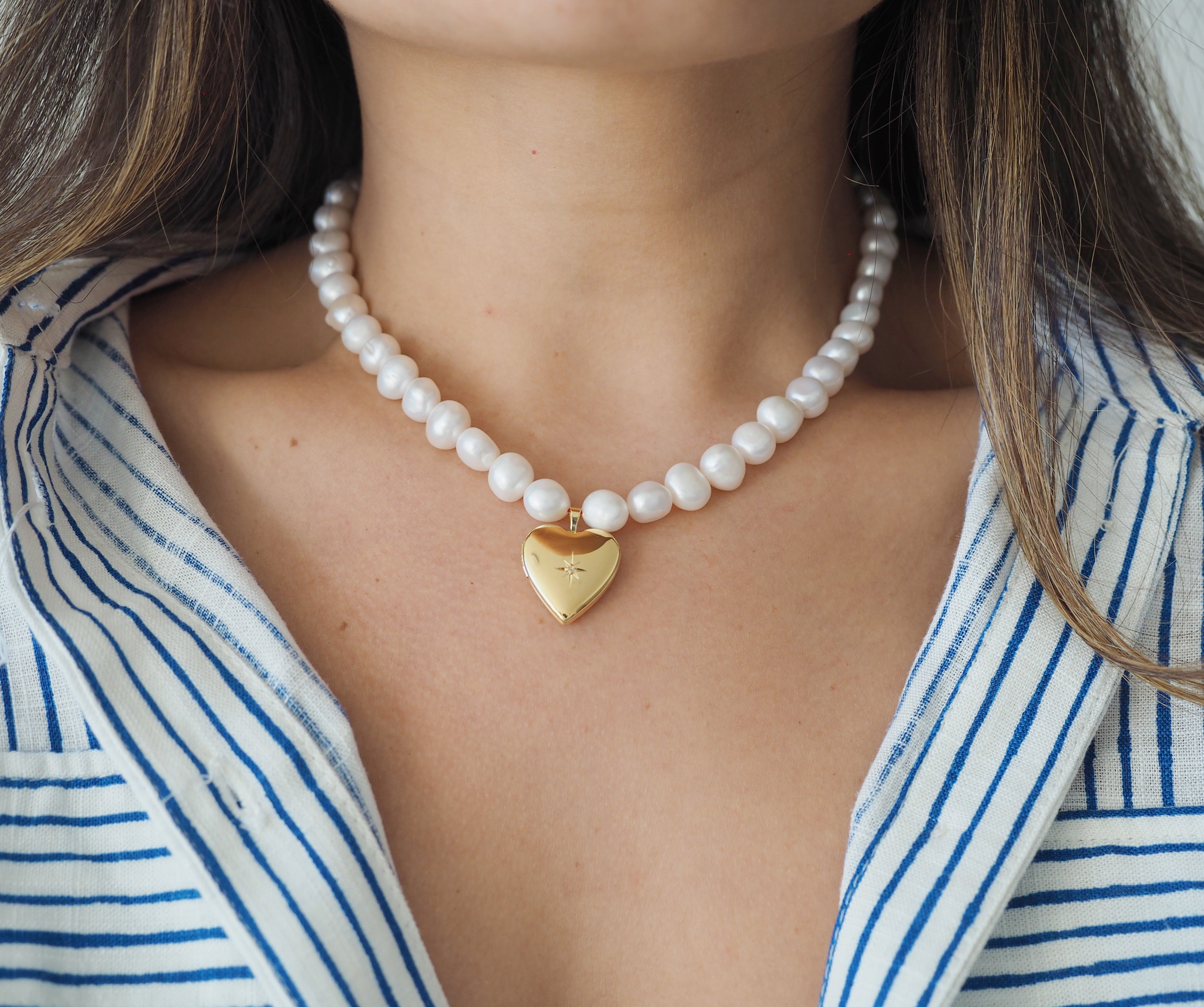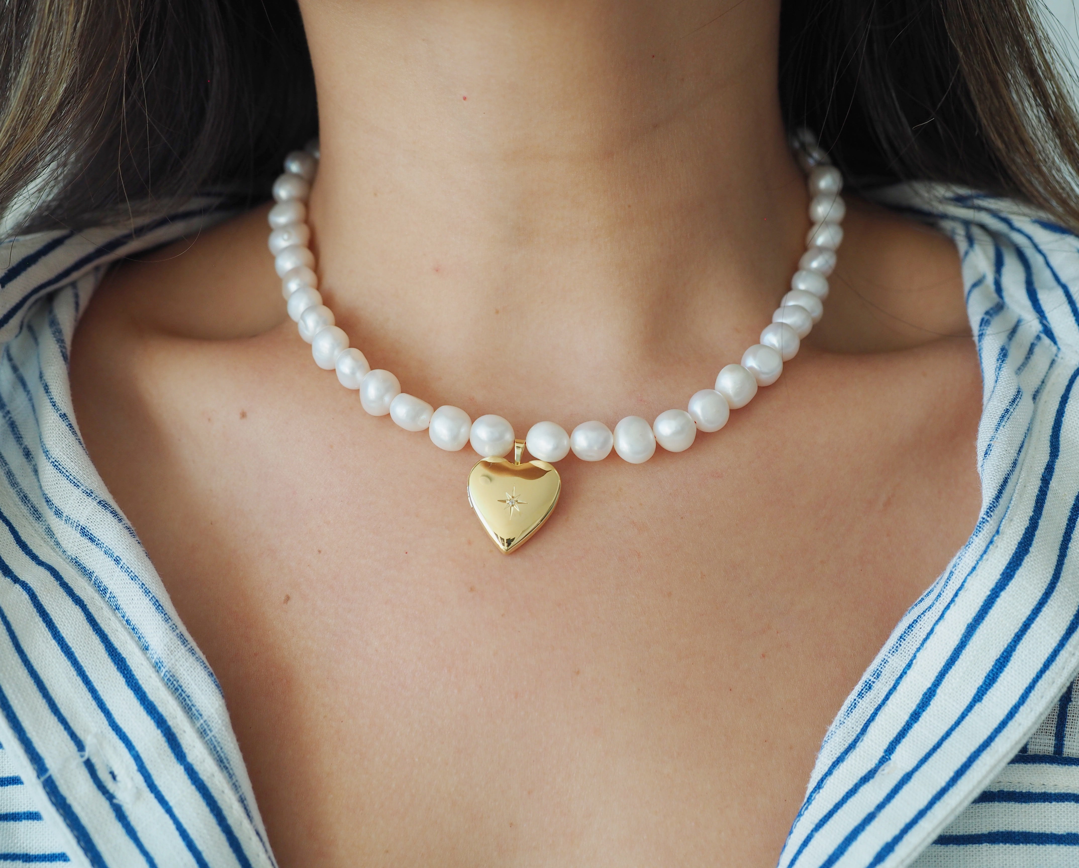 Freshwater Pearl and 14k Gold Filled Heart Starburst Locket Necklace